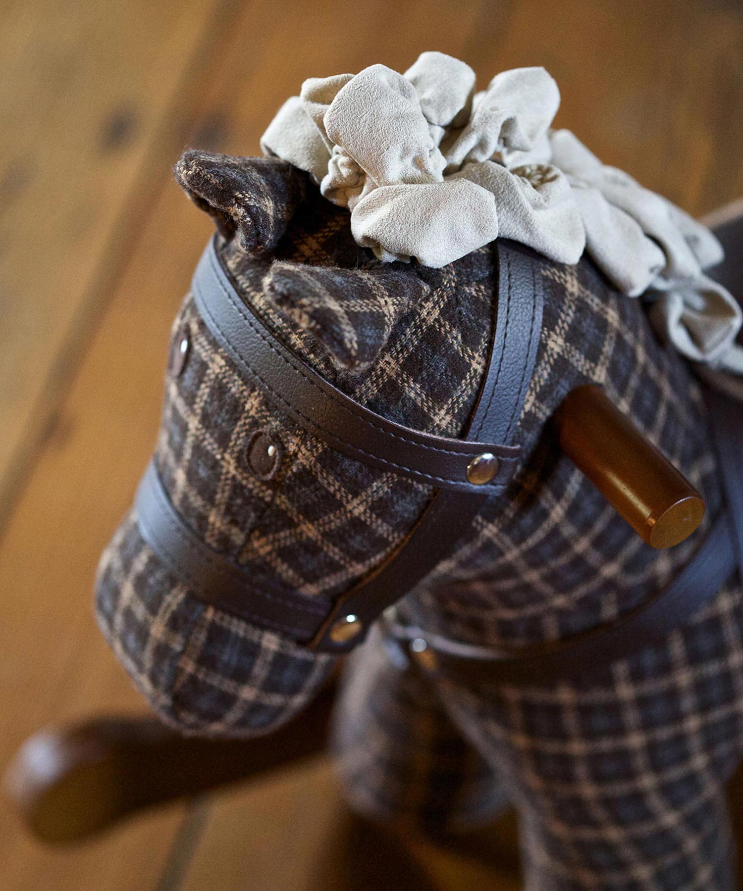 Standing on a sturdy walnut stained bow rocking base, Rufus is as gorgeous as they come! He is dressed in a textured chocolate and cream woven check fabric and has a softly padded traditional leatherette saddle and bridle. Inside his pocket is his friend Ted, soft cuddly removable bear that likes to come along for the ride. Rufus comes complete with a scrunchy faux suede mane & tail, wooden handles and removable foot plates • 'Rufus' the rocking horse and his pal 'Ted' the cuddly toy!