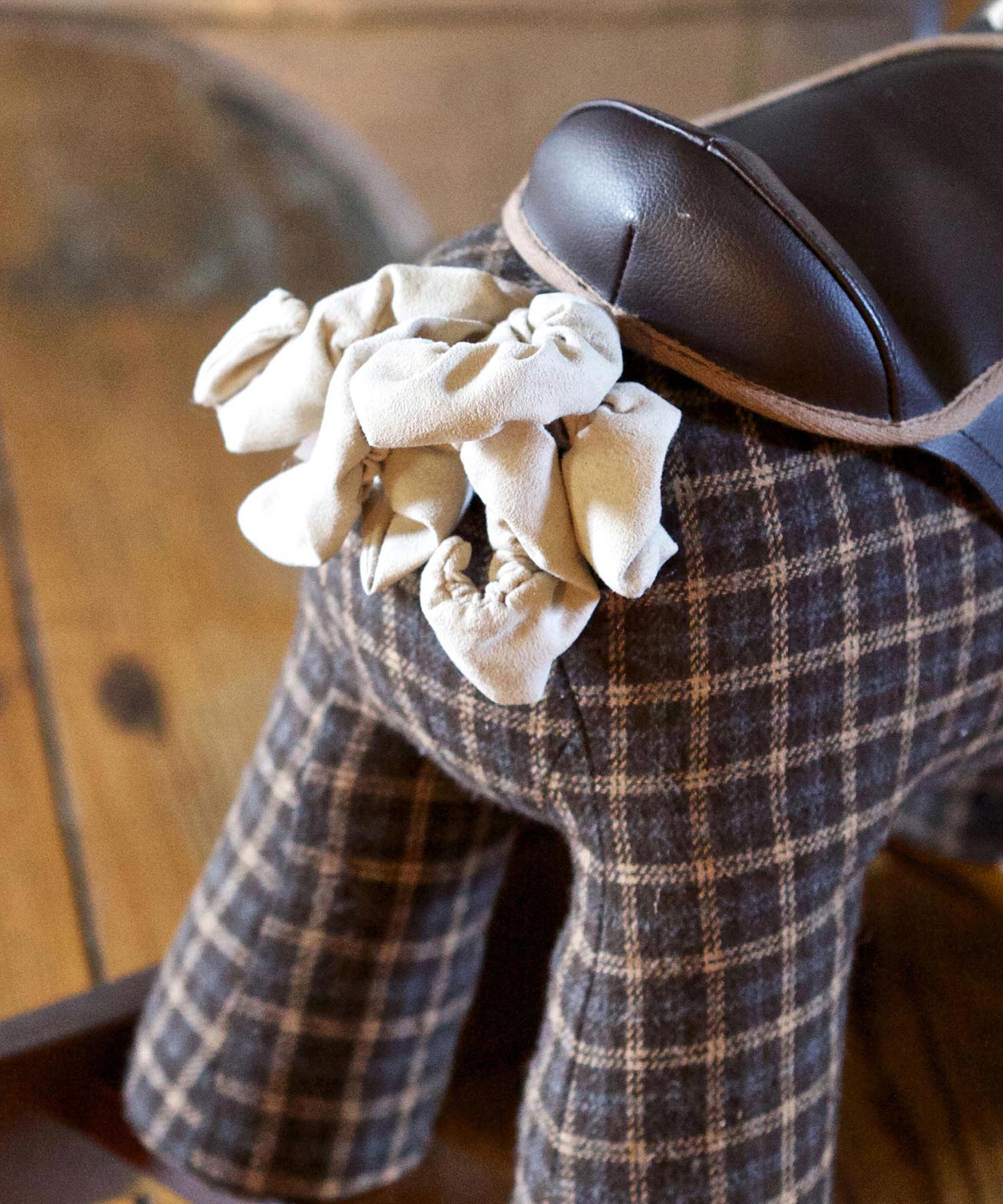 Features a textured woven check fabric and has a softly padded traditional leatherette saddle and bridle.