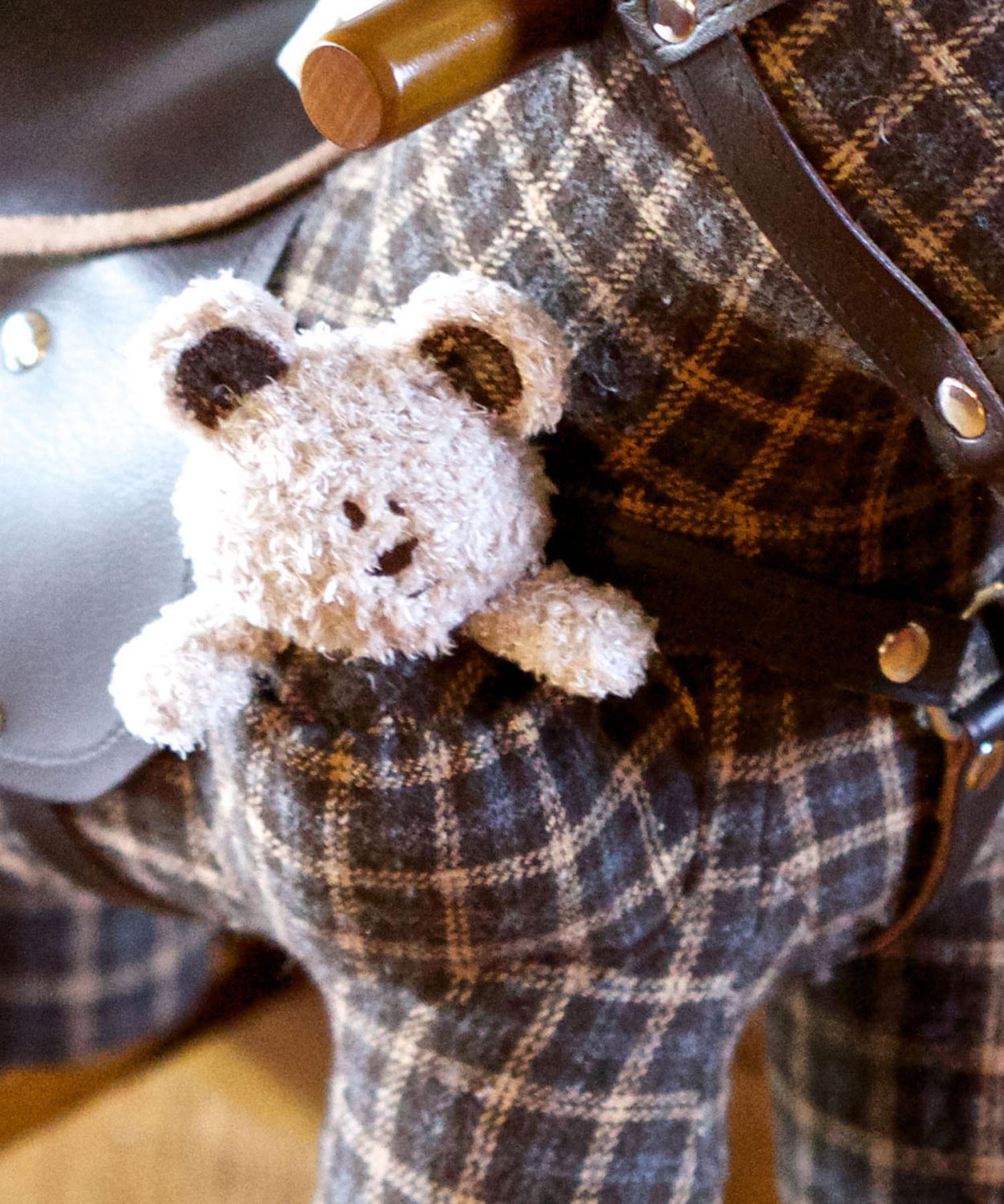Included is Ted, a small cuddly removeable toy who sits in the pocket and enjoys the ride.